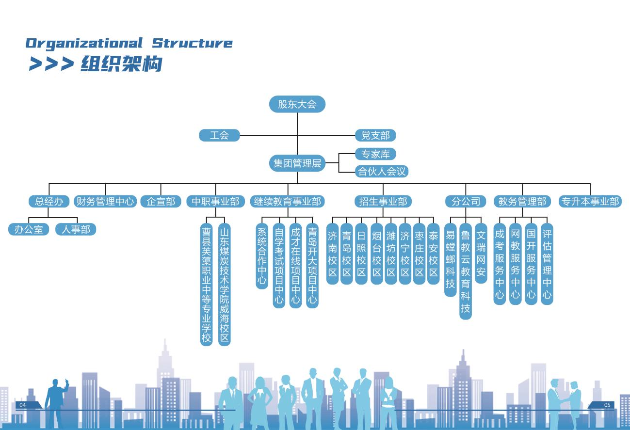 文瑞教育集团成立于2015年,总部坐落于泉城济南,集团总部自有办公面积1500余平,现有教职工500余人,业务涵盖学历继续教育服务、非学历培训、全日制专升本培训、中等职业教育、成教信息化系统研发、高校数字化资源建设、网络安全技术研发等。经过多年发展与北京外国语大学、中国传媒大学、西北工业大学、电子科技大学、东北农业大学、东北林业大学、山东理工大学、山东开放大学等省内外20余家高校开展校企合作,累计服务学生50余万人。