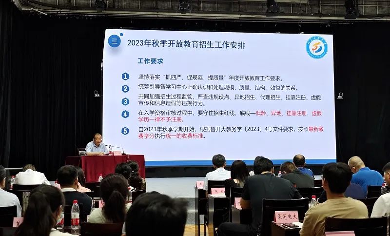 6月13日,山东开放大学举办全省开大(电大)开放教育招生考试工作研讨活动。学校党委委员、副校长谢明浩出席活动并讲话,我校副总经理叶国卿及全省各市(直管县)开大(电大)主管开放教育工作的校领导和负责招生、考试工作相关工作人员以及学校教务处相关工作人员共计100余人参加活动。